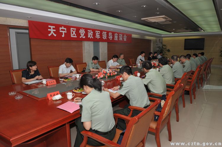 为迎接中国人民解放军建军85周年,26日下午,我区召开党政军座谈会,同叙军民鱼水深情,共绘双拥工作蓝图。常州市军分区副司令员韩涛,区领导陈正春、顾卫东、嘉秀娟、潘立波、管黎芳,各驻区部队首长出席了会议。 区长陈正春代表区委、区政府,向驻区部队全体官兵致以节日祝贺和亲切的慰问,对驻军部队长期以来对我区经济社会发展的关心和支持表示感谢! 陈正春指出,今年上半年,全区上下紧紧围绕率先基本实现现代化总目标,全力实施“推进城市更新,打造品质之区”总战略,全区经济社会保持平稳较快增长。主要体现在四个方面:一是征收,围绕两大新城建设以及老城区改造规划,顺民意加快征收,推动土地资源的整合利用;二是转型,发挥科技创新对转型升级的推动作用,集中资源,重点打造科技含量高、创新能力强的重点项目,对传统的制造业、落后的产能,督促其转型;三是建设,加大城市基础设施的投入,加快建设配套设施,加快完善城市功能,加快推进园区建设,加快引进大型城市综合体;四是帮扶,针对企业生产经营的实际困难,认真研究经济走势,有针对性地加强经济运行的组织调解,帮助企业克服融资、审批等难题,提升企业信心。 陈正春希望,驻区部队继续发扬优良传统,一如既往地关心和支持天宁的各项事业,加强感情联系和沟通,巩固军政、军民团结的大好局面,为天宁现代化建设作出贡献。 常州市军分区副司令员韩涛用“受教育,受鼓舞,被感动”三句话来感谢天宁区委、区政府对子弟兵的厚爱,他表示,加强军政军民团结,是我党我军的光荣传统和政治优势,部队建设要和地方政府协调发展,驻常广大官兵将把常州作为第二故乡,努力为天宁各项事业发展贡献力量,以此来回报家乡人民。