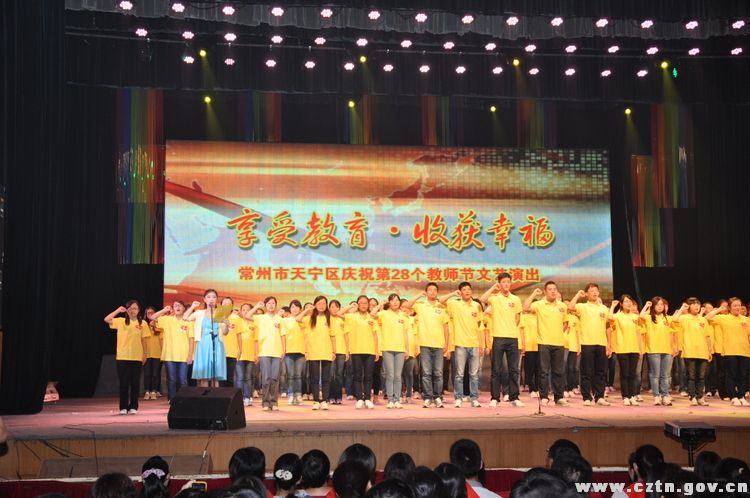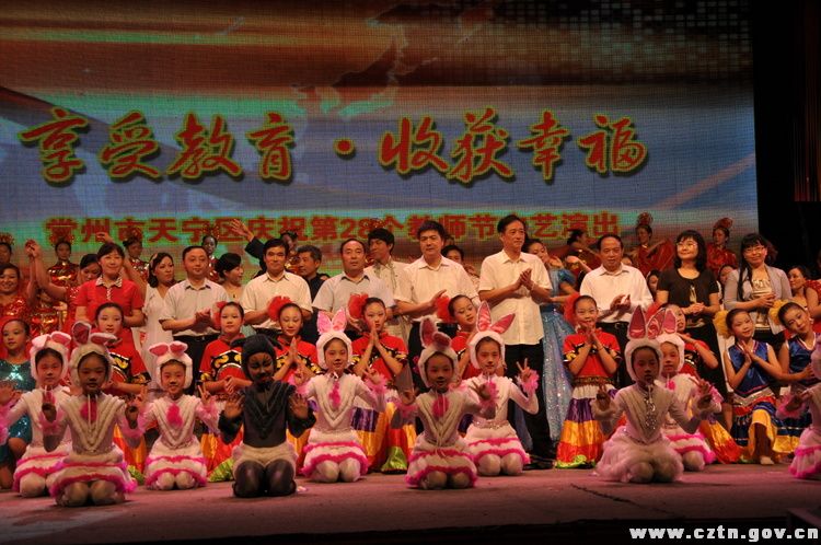 9月8日下午,我区以“享受教育 收获幸福”为主题,在武进影剧院(常州大舞台)隆重举行大会,庆祝第28个教师节。市教育局领导、区四套班子领导,与来自全区教师代表、教育工作者代表和2012年新录用教师一起参加了庆祝活动,并向受表彰的优秀教师和教育工作者表示祝贺。 区委书记陈正春出席大会并致辞。陈正春指出,长期以来,全区广大教师和教育工作者自觉贯彻党的教育方针,忠实履行人民教师的神圣职责,扎实做好本职工作,为我区教育事业发展和经济社会建设付出了大量心血,作出了积极贡献,赢得了社会的广泛赞誉和普遍尊重。他希望通过今天的表彰,在全区教育系统形成一种崇尚先进、争当先进、争创佳绩的良好风气,进一步鼓舞和激励广大教育工作者为我区教育事业的发展作出更大贡献。 大会表彰了江苏省人民教育家培养对象、江苏省特级教师、2012年度十佳优秀教育工作者和十佳师德标兵。区委书记陈正春、代区长宋建伟、市教育局党工委书记潘建中、区教育促进会名誉会长刘灿放分别为受表彰人员颁奖。2012年新录用教师在局小青年教师许嫣娜老师带领下举行了庄严的新教师宣誓仪式。此外,来自全区各中小学、幼儿园的教师和部分学生还表演了大型歌舞、音诗画、快板说唱、少儿舞蹈等节目。