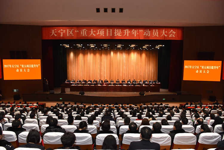 今年是天宁区的“重大项目提升年”。新春佳节刚过,我区召开“重大项目提升年”动员大会,连续4年聚焦重大项目建设。区委书记宋建伟强调,扎实开展“重大项目提升年”活动,必须牢固树立“把事情做到最好”的目标追求,高扬“想干事、肯干事、能干事、干成事”风向标,以“四铁精神”抓推进,以“比学赶超”促争先,一步一个脚印把“强富美高”品质新天宁的美好蓝图变为现实。 区长许小波主持会议。 区四套班子领导出席大会。 宋建伟向全区人民、所有为天宁发展作出贡献以及关心支持天宁发展的社会各界人士表示衷心感谢,并总结了过去一年天宁经济社会方面取得的新成绩。 宋建伟强调,今年确定为“重大项目提升年”,就是希望“项目为王”的意识在广大领导干部的脑中深深扎根、让“店小二”式的优质服务成为天宁各级各部门的闪亮名片。 围绕重大项目提升,宋建伟提出:要上下一心对标干,干出品质天宁新境界。经济发展新常态下,发展依然是第一要务。要科学把握大势,积极抢抓当前的宏观政策“窗口期”,利用ppp模式等机遇全力以赴推项目。要坚定发展信心,今年确定了100个区重点和11个市重点项目,要上下一心、干群同心,以更大的勇气和魄力,在新一轮改革发展中争取主动、打好基础、赢得未来。要明确发展路径,坚持以“园区”为载体、以“楼宇”为抓手、以“文化”为根脉、以“互联网+”为导向,在集聚、集中、集成中加大有效投入,实现数字经济、共享经济和智慧经济的新突破。 要突出重点精准干,干出跨越发展新成效。提升发展人文旧城,抢抓轨道交通、棚户区改造机遇,加快文化宫购物中心等重要节点的业态、形态提升;整体规划改造北太平桥—新丰桥—小东门桥—东货场、青龙港片区,发展高端业态,打造常州的“渔人码头”;加快推进郑陆东青片区、龙城大道两侧、青龙西路南侧城中村连片改造,提升城市承载力和竞争力。突破发展两大新城,天宁新城围绕“两廊一心”总体布局,全力推进金融商务区等专题园区建设,建设全省领先的产城融合示范区。凤凰新城要瞄准“十年成城”目标,加快推进凤凰新城生命科技园等重大项目建设,深度引进和培育高端优质教育、医疗等配套资源,着力打造宜居宜业休闲创智半岛。攻坚发展都市花园镇,围绕“千年圣贤地、山水梦想镇”的目标定位,力争八大项目齐发力,共同打造山好、水好、业态好的现代都市花园镇。 要加强学习创新干,干出担当作为新面貌。解放思想是做好一切工作的前提和基础,要敢于冲破不合时宜的思想禁锢、行动制约和体制束缚,坚持在学习中求创新、坚持在创新中求突破、坚持在突破中求发展,以思想大解放、观念大更新,实现项目建设大提升。 要撸起袖子加油干,干出比学赶超新气象。牢牢扛起责任,各级领导干部要深入一线、扎根一线,及时协调解决问题,广大企业家要抢抓发展机遇,不断提升企业核心竞争力。全面提升效能,转变服务理念,优化服务方式,在提高审批效率上下功夫,确保项目在第一时间、最短期限内签约开工、投产达效。持续改进作风,党员干部要始终保持危机意识和争先精神,雷厉风行抓落实,全力以赴促项目。 要脚踏实地务实干,干出团结奋进新局面。开展好“重大项目提升年”活动,关键在于真抓实干。全区上下要“拿出闯劲、坚持韧劲、铆足干劲”,强化督查考核、狠抓项目推进、广泛凝聚合力,真干实干、踏实苦干,全面完成“重大项目提升年”各项目标任务。 就贯彻落实会议精神、开展好“重大项目提升年”活动,许小波强调三个“再提升”:一要推进工作的思维要再提升,用系统思维来谋划,用创新思维抓推进,用底线思维做保障。二要项目建设的成效要再提升,项目招引的力度要更大,着力引进一批先进制造业和现代服务业优质项目,提升引资的质效;项目推进的速度要更快,细化工作方案,落实岗位责任,坚持问题导向,提升项目质效;载体平台的品质要更优,高标准推进大健康产业园等园区建设,高效整合盘活楼宇、商业综合体资源。三要担当作为的精神要再提升,要担当在先,把重大项目建设摆在突出位置,敢于迎难而上、挺身而出;要提升能力,不断学习、实践、总结,吸收最新发展理念,切实提高履职水平;要富有激情,继续发扬天宁干部讲奉献、能吃苦的优良作风,以舍我其谁、勇立潮头的激情奋勇拼搏、攻难克险。 会议表彰2016年度税收贡献二十强企业、企业上市(挂牌)先进单位、品牌建设先进单位和优秀领军人才创业企业、绩效评估和综合考核先进单位及突出贡献奖、创新成果奖、特别贡献奖、2016年度社区建设工作先进单位、“执法标兵”和“杰出平安卫士”代表等。 天宁经济开发区、郑陆镇、天宁街道、区商务局、国土天宁分局、常州中交建设发展有限公司、江苏武进不锈股份有限公司、常州天宁建设发展集团有限公司、中国常州检验检测认证产业园作了表态发言。
