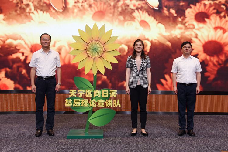7月5日,天宁区举行增强“四力”教育实践暨天宁“向日葵”基层理论宣讲队成立仪式,成立全市首个区级基层理论宣讲团队,并开展首轮宣讲。省委宣传部讲师团团长李良慧,市委宣传部常务副部长孙春伟,区委常委、宣传部部长韩波出席活动。 孙春伟表示,近年来,常州积极推进基层理论宣讲工作,选拔了一批优秀理论宣讲示范点、理论宣讲示范队和理论宣讲带头人、先进个人。天宁成立全市首个区级基层理论宣讲团队,将为天宁基层理论宣讲注入了新活力、集聚新动力、夯实新基础。宣讲队要坚定政治立场、筑牢理论功底,拿出时间和精力深入基层,用接地气的形式、沾土气的感情,让新思想新理念传入千家万户。 韩波表示,成立天宁区基层理论宣讲队,就是要让更多的优秀宣讲员走进基层,走进新时代文明实践中心(所、站),把党的创新理论源源不断输送到广大党员群众中去,真正“飞入寻常百姓家”。每一位基层宣讲员要切实履行宣讲职责,积极探索宣讲新路径,以更直观、更有效的方式,推动习近平新时代中国特色社会主义思想和党的十九大精神在天宁落地生根。 本次成立的天宁“向日葵”基层理论宣讲队,是全市首个区级基层理论宣讲团队,首批23位队员中有全国人大代表、团中央委员会常委、全国最美城乡社区工作者、中国好人、江苏好人、道德楷模,也有普通的一线工作人员。活动现场,有6位队员进行了首轮宣讲。 今年三季度,“向日葵”基层理论宣讲队的队员们将依托新时代文明实践所(站),围绕不忘初心跟党走、学习践行新思想、坚定文化自信等23个主题,深入镇、街道、村(社区)开展宣讲,把科学理论融入感人故事,把抽象道理融入鲜活人物,让理论宣讲真正扎根基层、播进百姓心里。