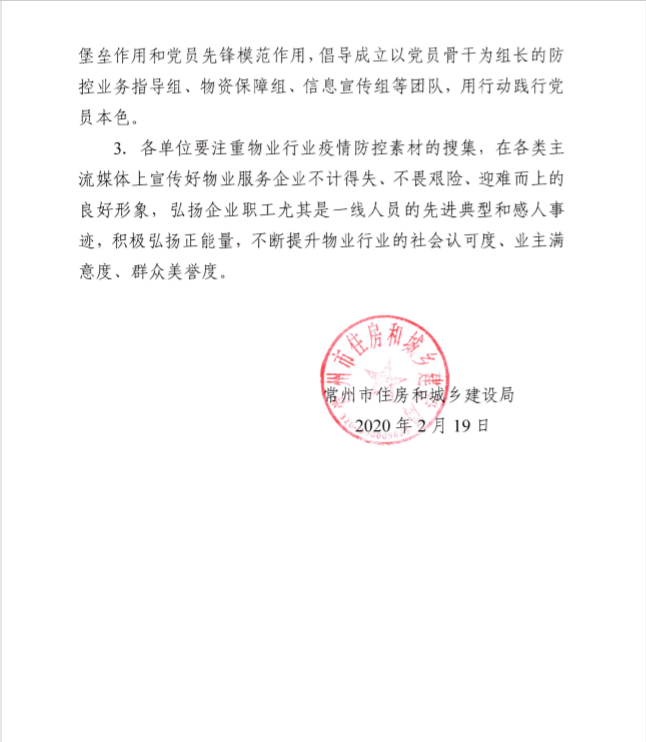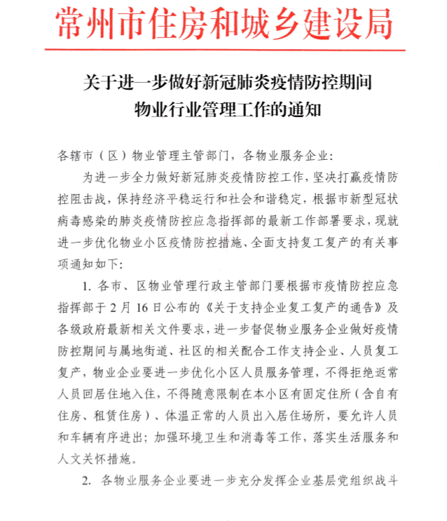 治疗一线是医院,预防一线是物业。“《关于进一步做好新冠肺炎疫情防控期间物业行业管理工作的通知》,请各位服务企业、各物业服务项目查收…”天宁区住建局组建的全区物业服务企业工作群内,保障复工复产工作的通知发布,各物业服务企业纷纷响应,及时调整防控措施,为返常复工人员“回家”提供保障。