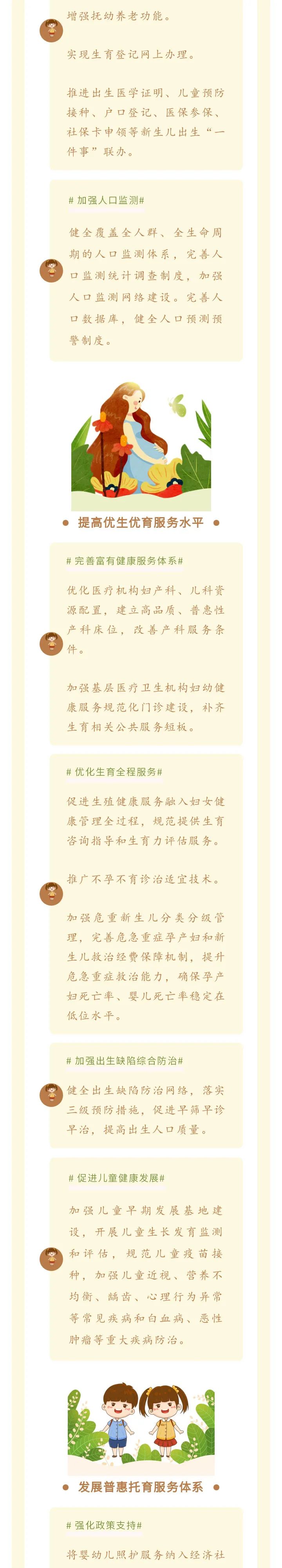 3.健全人口服务体系。以“一老一小”为重点,建立完善覆盖全生命周期的人口服务体系。加强基层服务管理体系和能力建设,在城乡居住社区建设改造中,建设与常住人口规模相适应的养老托育服务设施,增强抚幼养老功能。实行生育登记服务制度,实现生育登记网上办理。推进出生医学证明、儿童预防接种、户口登记、医保参保、社保卡申领等新生儿出生“一件事”联办。