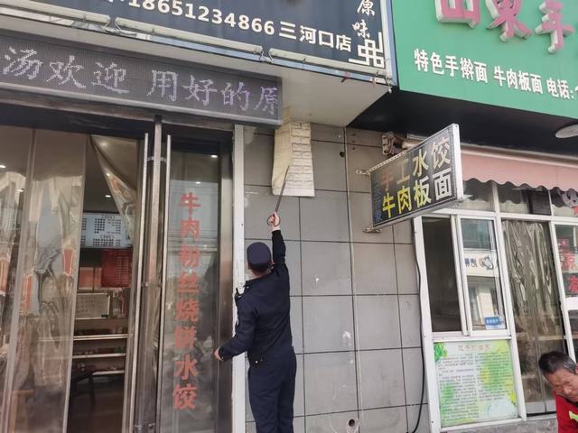 整治过程中,城管队员劝离占道经营摊贩、对店外占道经营、店前杂物堆积的商户进行劝导,宣传“门前三包”责任制,不断增强商户参与门前治理的积极性,提高商户规范经营的意识。