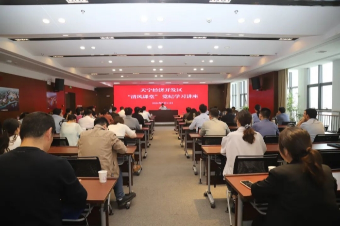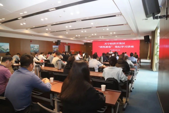为认真贯彻落实中央、省、市区委及开发区党工委关于在党员干部中开展党纪学习教育的工作方案,推动开发区各级党员干部认真抓好《条例》的学习,进一步增强纪律意识、提高党性修养,不断夯实坚定拥护“两个确立”、坚决做到“两个维护”的思想根基,努力做自我革命的表率、遵规守纪的标杆。5月11日,天宁经济开发区召开“清风课堂”党纪条例学习讲座。会议由区委常委、开发区党工委书记周海鹏主持。
