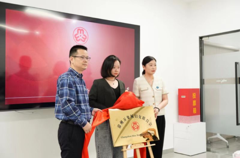 天宁区妇联言虹、茶山街道人大工委主任、总工会主席冯兵、新当选妇联主席孙倩共同为常州万象城妇联揭牌。