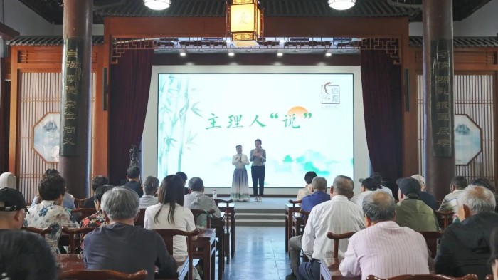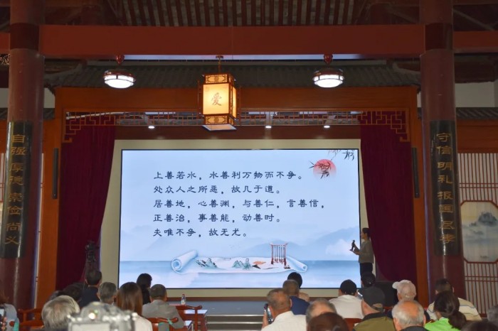 水的特质被升华为“至善”的象征,既指自然形态的流动、包容、滋养,更隐喻理想人格应具备的品格。“不争”并非消极避世,而是指超越世俗功利性争夺的生存智慧,如水利万物却不索取回报。活动现场,由主持人领读,带领大家一起学习道德经。