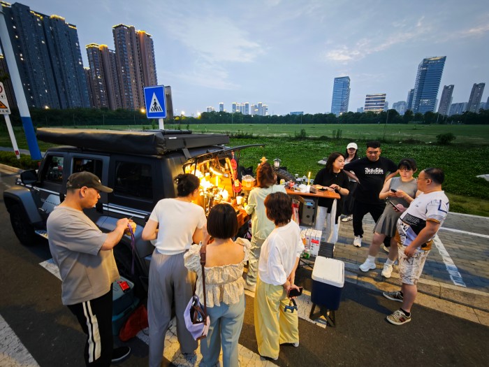 一辆汽车,一套咖啡机,一个后备箱简易吧台,打开车尾箱,收拾就绪,移动咖啡车即可营业。最近两个月,被网友亲切地称为“后备箱咖啡第一人”、抖音账号拥有13.5万粉丝的罗大菲在青龙街道的一块绿地旁出摊了!远远望去,有不少粉丝正有序排起长队,他们一边享受夕阳落山美景,一边品味咖啡,融入自然、享受惬意。“我们这里没有人点单,全都是他们标上序号、自己手写的,”罗大菲边说,边一杯接一杯地制作咖啡,不时还要跟直播间的朋友们互动:“不同机器烘出来的豆子口感是不一样的,如果大家想学做咖啡的话,记得点点关注哦。”