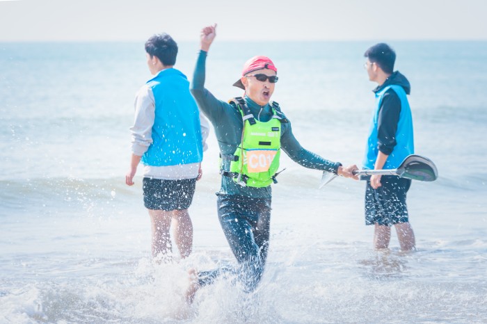 惊险出现在最后3公里,王巍洪一桨插在波峰,紧接着一桨又插到了波底,立马翻艇落水。如果上艇速度慢的话,浪会把人推走的。所幸,平时基本功扎实,他3秒上艇。看到已经有人超过自己,他奋起直追,最终第一个冲过终点。“第2名就比我慢26秒!当时特别激动,一上岸,一手拿桨,一手指天!朋友还给我拍下这张照片。”