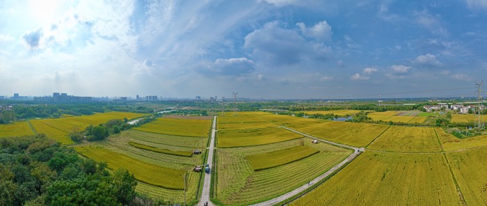 10月29日,稻浪千重,鎏金遍野。金秋时节,天宁区武城村的800多亩稻田里,收割机轰鸣穿梭,村里的工作人员抢抓晴好天气忙收割,生动的丰收画卷在田间地头徐徐展开。