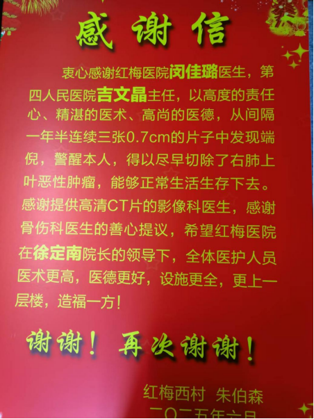 朱老先生用一封饱含深情的亲笔信,诉说了一段从细微处发现隐患、及时干预挽救生命的动人故事,也彰显了常州市肿瘤医院与红梅街道社区卫生服务中心紧密协作,早筛早诊的成果。 朱伯森老先生是红梅西村的居民。了解到吉文晶主任在红梅中心的肺结节专科坐诊后,他带着一年半内拍摄的三张肺部CT片前来咨询。粗看是三张平常的片子,但吉主任凭借其丰富的肿瘤诊疗经验和对影像细节近乎苛刻的严谨,敏锐地捕捉到了朱老先生右肺上叶一处0.7cm的病灶在时间维度上有细微变化。发现异常后,吉主任迅速通过常州市肿瘤医院与红梅中心建立的高效转诊绿色通道,将朱老先生转至常州市肿瘤医院进一步检查。 经过社区门诊的早期筛查、院际之间配合协作及专业团队的精确诊断,最终,朱老先生及时接受了右肺上叶恶性肿瘤切除手术,术后恢复良好。 朱老先生的亲笔感谢信,字字恳切,句句真情。信末那连续的两个“感谢”是劫后余生者对生命守护者最朴素、最真挚的至高褒奖。 |