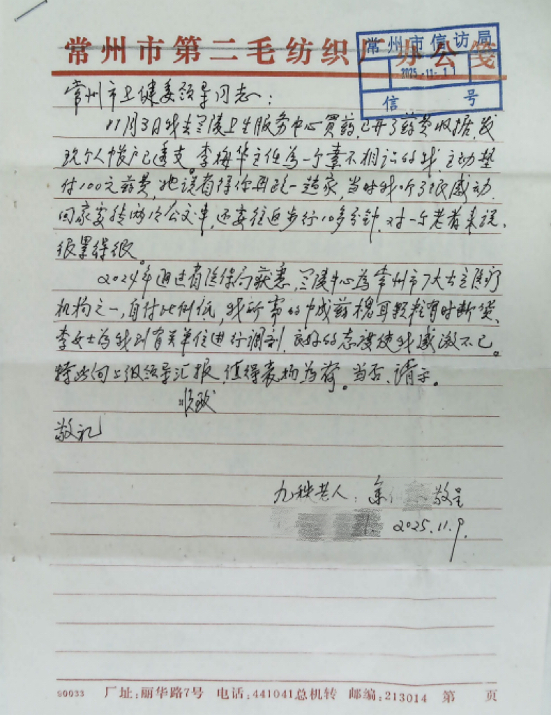 原来,11月3日,九十多岁高龄的余老伯在兰陵街道社区卫生服务中心配药时,遇到了一件尴尬事。当时,他配药结账时差了100元,回家取钱需转两次公交,老人瞬间犯了难。这时,药剂科主任李梅华发现了这一情况,上前询问后主动为老人垫付了100元药费。这一举动,看似微小,却如冬日里的一缕暖阳,温暖了老人的心。事后,深受感动的余老伯特意写下一封感谢信寄往市卫健委。 其实,日常工作中李梅华主任常对身边的同事说:“患者来一趟不容易,尤其是老年人,我们能多想一步就一步,能多帮一把就一把。”正是这份设身处地的共情与担当,让兰陵中心的医疗服务不再只是冰冷的流程,增添了人性的温度。 |