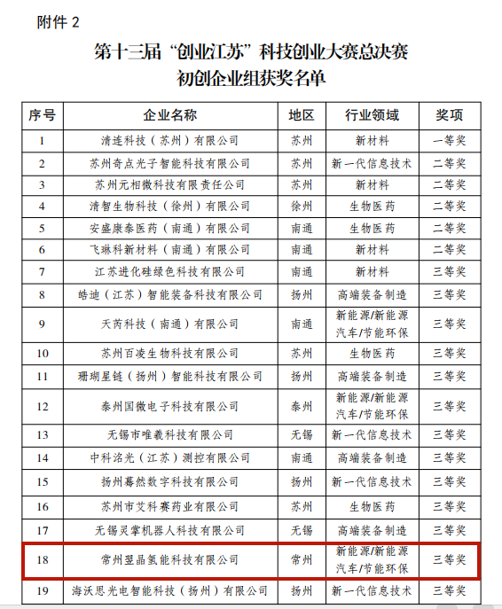日前,第十三届“创业江苏”科技创业大赛总决赛暨第十四届中国创新创业大赛,江苏赛区总决赛圆满收官。天宁区企业常州翌晶氢能科技有限公司获大赛初创组三等奖,为常州地区唯一一个初创组获奖企业。