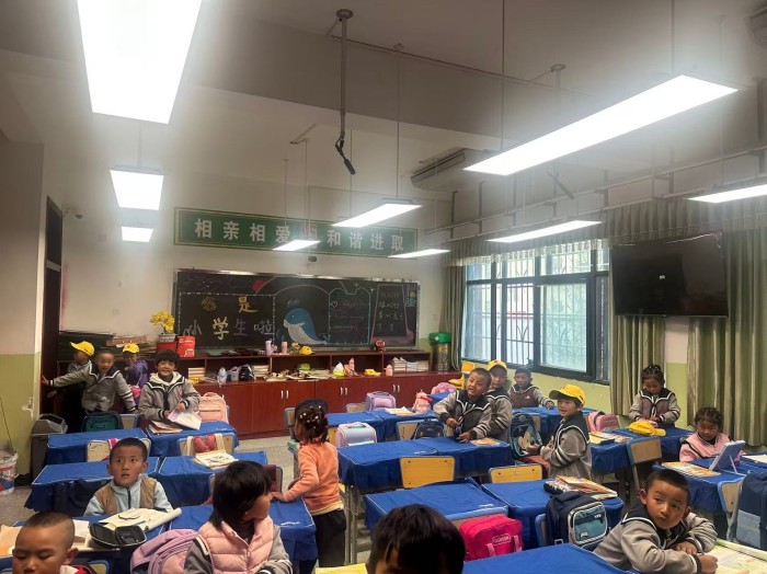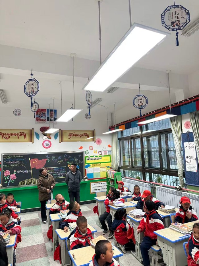在西藏日喀则市拉孜县完全小学里,太阳仿佛“掉”进了教室里。原先昏暗的灯光,全部被一排排崭新的护眼大灯所替代。“现在的灯可以照到每个角落!”“以前的灯很刺眼,现在一点都不刺眼”“不仅明亮了,眼睛还觉得很舒服!”孩子们操着不太标准的普通话,兴奋地表示。