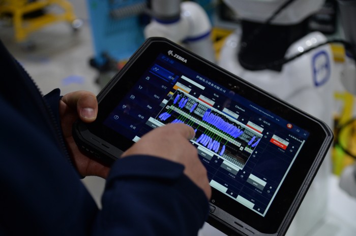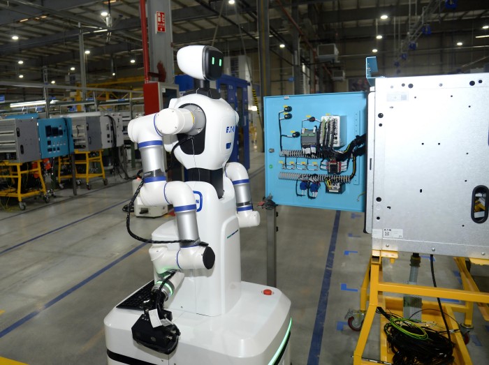 3月23日,在伊顿电力设备有限公司(以下简称伊顿电力)的车间里,一台人形机器人正在对一只仪表箱进行扫描。它先用摄像头识别箱体上的二维码,调取后台设计数据,再通过3D扫描获取箱内几百根接线的实际布局,最后进行校对——原先人工需要一个半小时才能完成的箱体检测,如今被压缩至十几分钟。