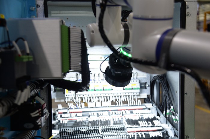 这台仪表箱接线检测机器人解决的,是一个长期困扰行业的痛点。公司OPEX经理穆雪妮介绍,在电力设备的电柜核心区域,接线控制着整个系统,几百根线缆必须百分百正确。过去,工人需要拿着图纸、身体探进箱子里一根一根核对,工作强度极大,极易出错。曾有一位资深员工在做这个岗位两个月后提出离职,“一个箱子几百根线,一天上百个箱子,几万个线头,眼睛都要看花了。”而现在,扫描完成后,数据被传至后台,AI模型自动提取样本信息,并与设计图进行比对,直接标出异常点。穆雪妮表示,这是他们与上海飒智智能合作研发的工业机器人,近日刚刚调试成功并投入使用。