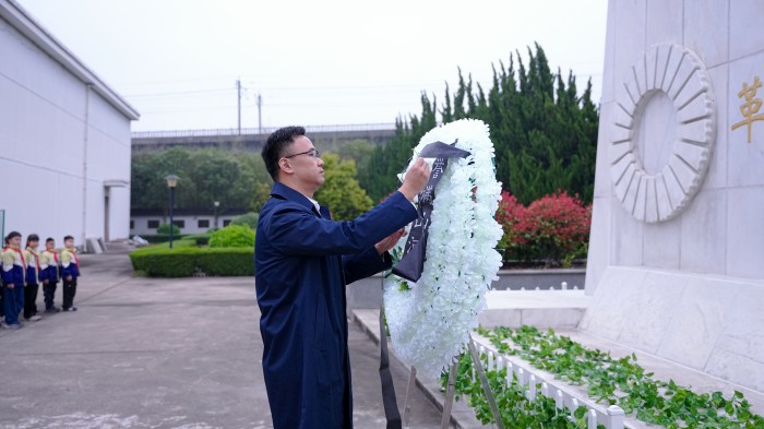 经开区党工委副书记、管委会主任汤心宇代表全体人员敬献花圈,整理挽联,朵朵白花寄托着对革命先烈的无限敬仰。