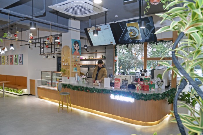 复古文艺的木色调装修、浓郁醇厚的咖啡香气,加上到处点缀满小花和绿植——走进位于青竹苑商铺一条街的孔妈星咖啡,这里看上去与任何一家温馨的咖啡小馆并无二致。