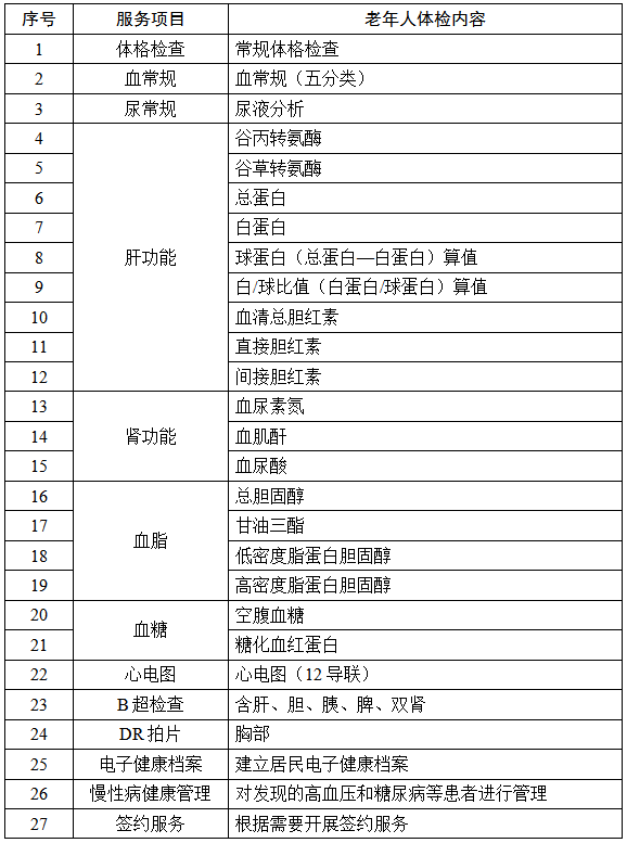 1.我区65岁及以上常住居民以其常住地址为依据,到其辖区属地所在各基层医疗卫生机构参加国家基本公共卫生服务老年人健康体检项目。详见表1。