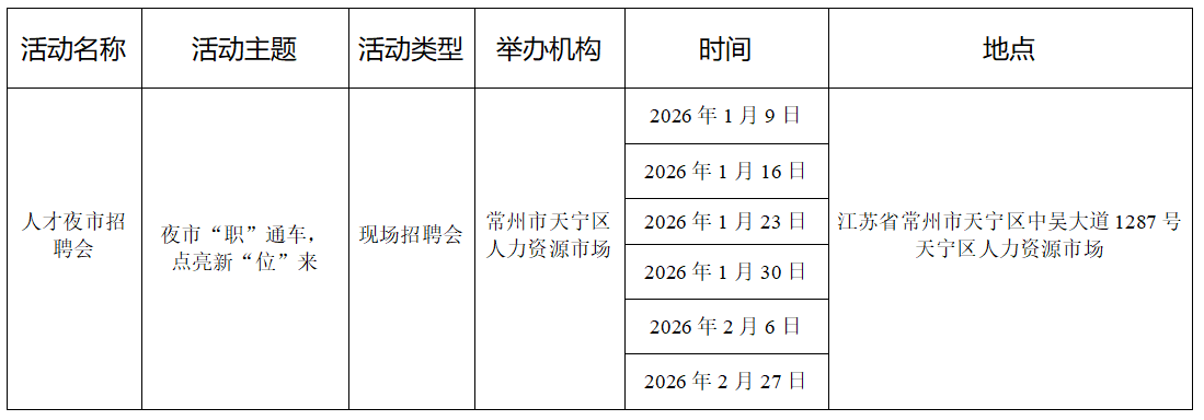 为落实就业优先战略和人才强省战略,促进人才就业与“夜间经济”深度融合,顺应各类劳动者高质量充分就业需求,构建“夜间服务+精准对接”的就业人才服务新场景,天宁区人社局根据省委、省政府工作部署,不断创新服务模式,优化资源配置,开展2026年“人才夜市”工作。